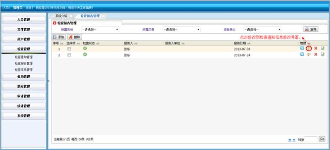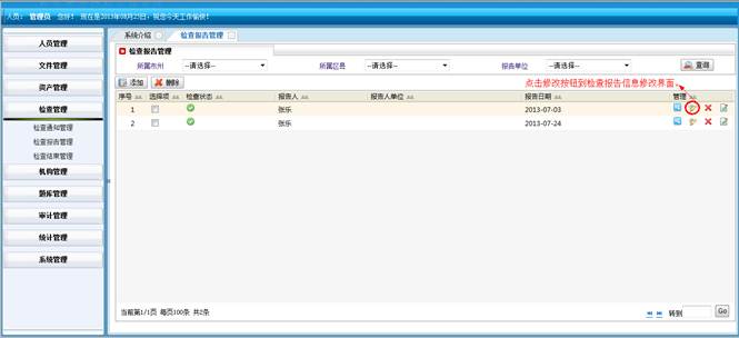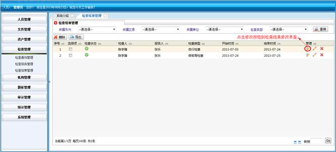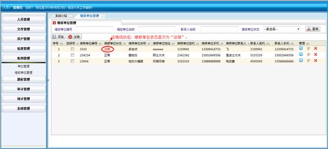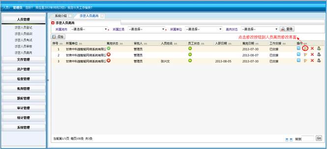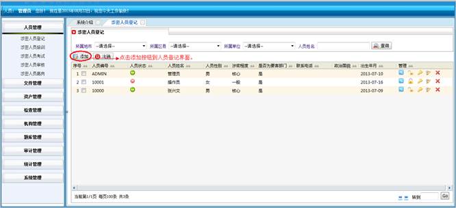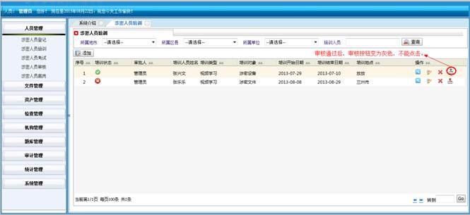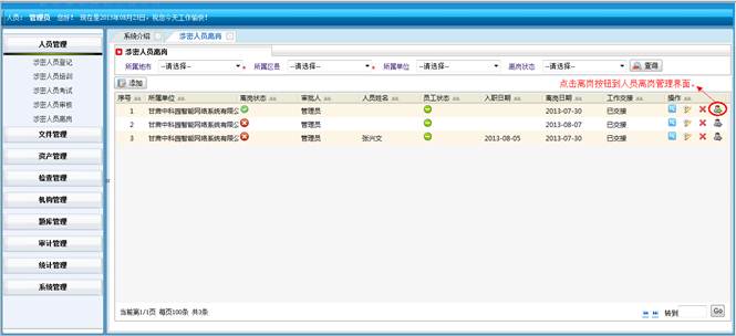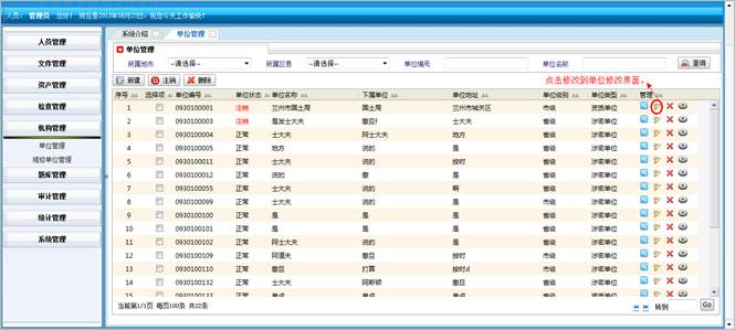 对人员操作系统的动作进行记录,包括:操作IP地址、操作单位名称、操作人员姓名、操作模块、操作功能和操作时间。同时可对记录进行查询操作。