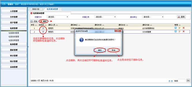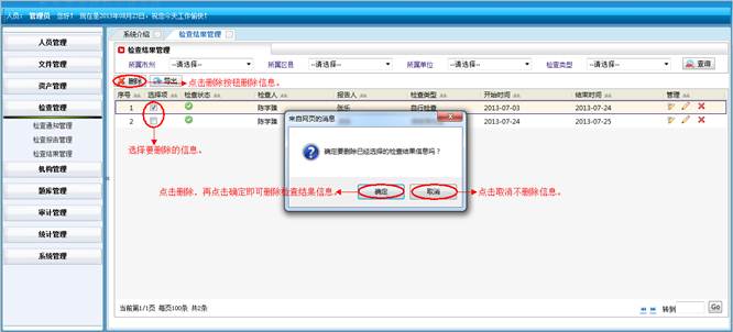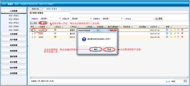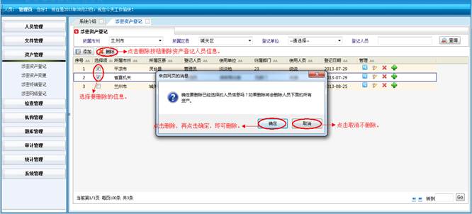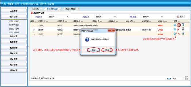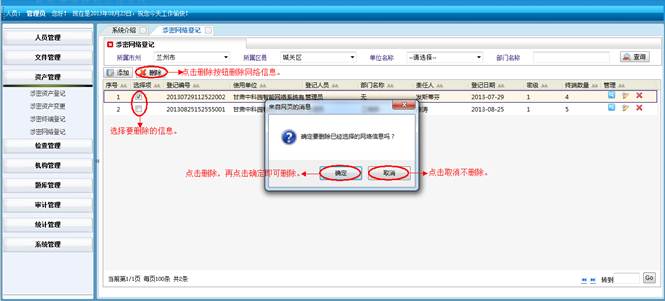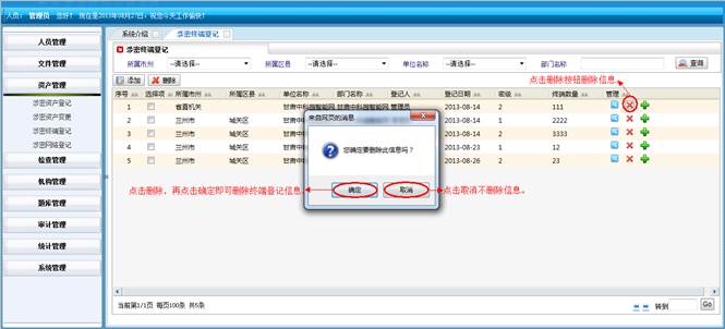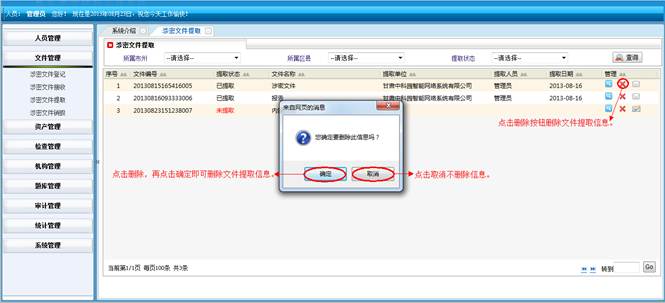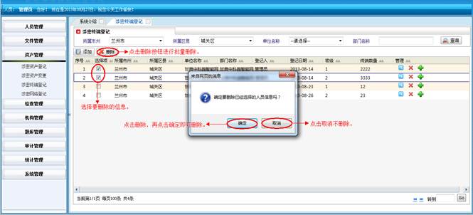 在涉密题库管理界面,选择要删除的信息,点击“删除”按钮,再点击“确定”按钮,进行批量删除题库信息,点击取消不删除信息。