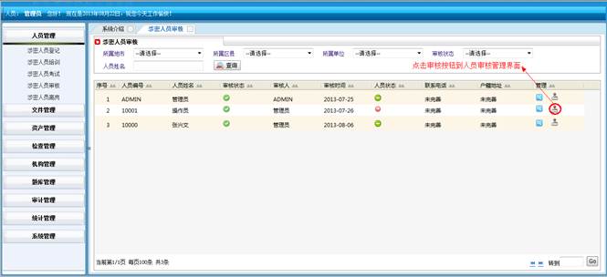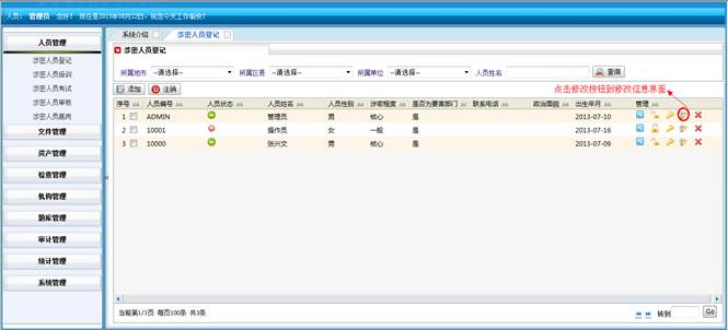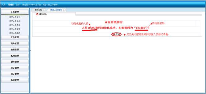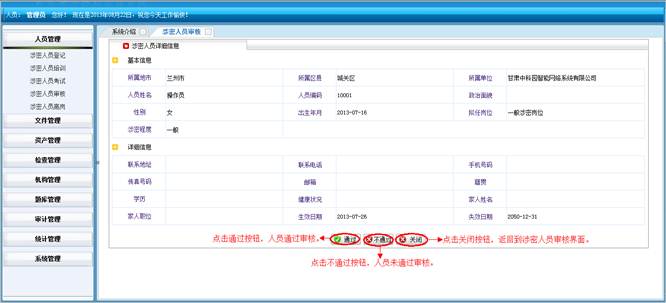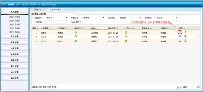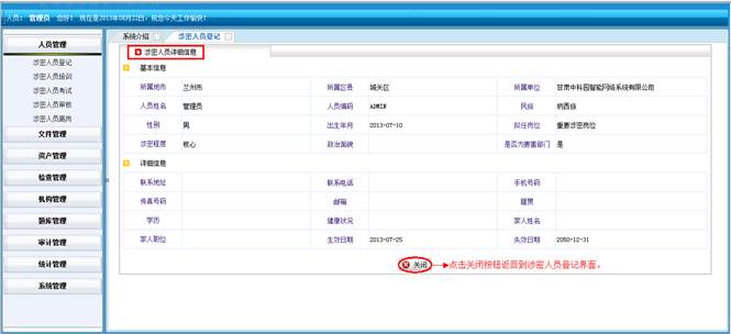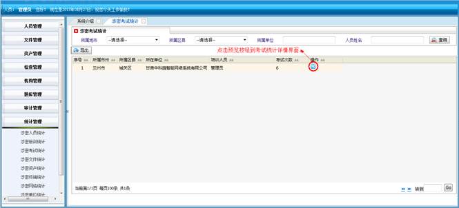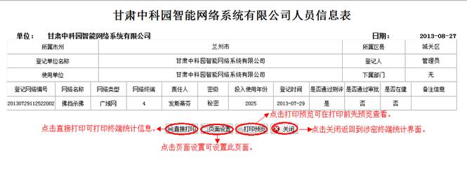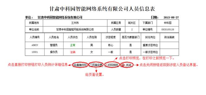 到人员统计详情界面,查看详细信息。然后点击“直接打印”打印人员统计的信息。点击“页面设置”设置页面。点击“打印预览”在打印前预览一下。点击“关闭”按钮返回到涉密人员统计界面。