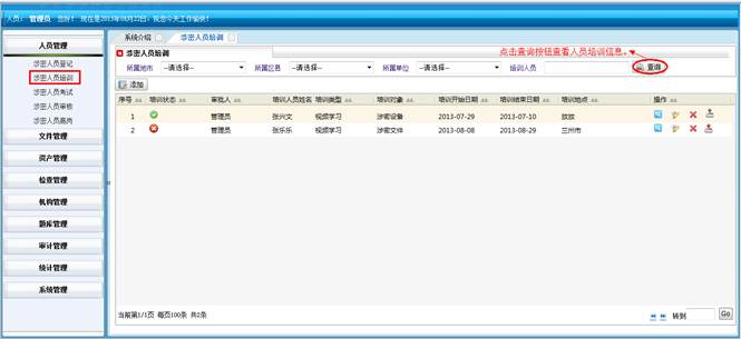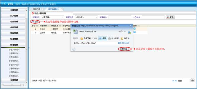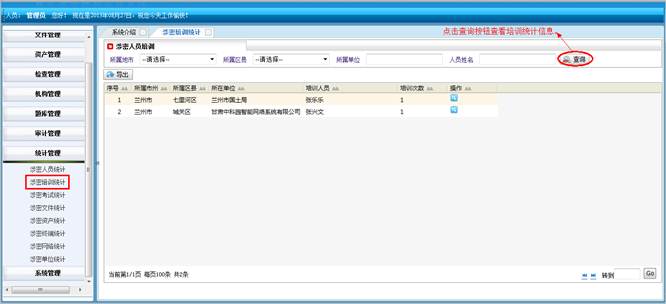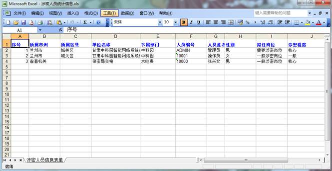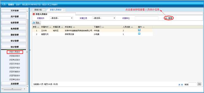 对所属地市和区县的涉密人员进行查询统计。将符合查询条件的信息导成EXCEL表格。