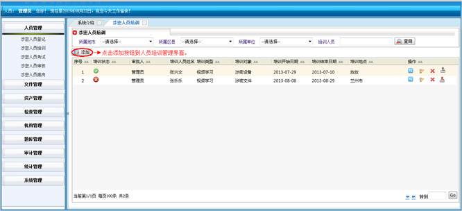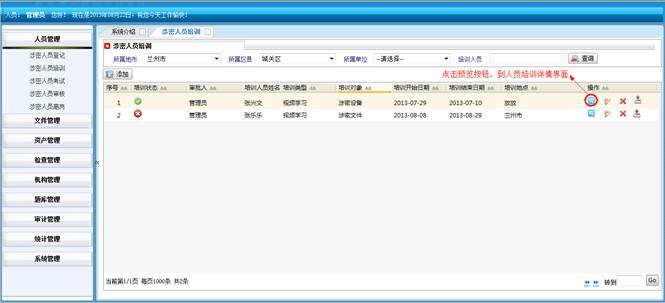 到培训统计详情界面,查看详细信息。然后点击“直接打印”打印培训统计的信息。点击“页面设置”设置页面。点击“打印预览”在打印前预览一下。点击“关闭”按钮返回到涉密培训统计界面。