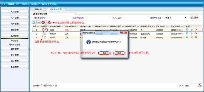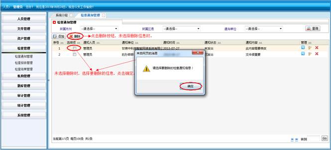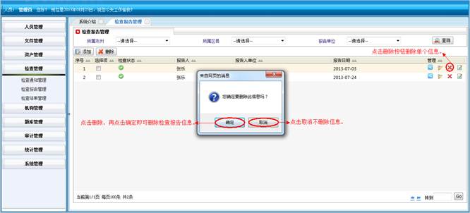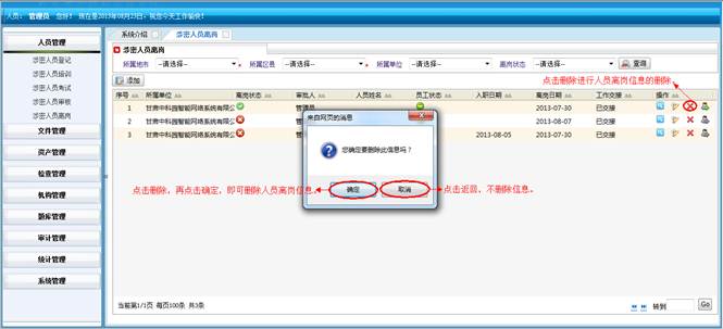 在角色岗位管理界面,点击“删除”按钮,再点击确定按钮,即可删除角色岗位信息。点击“返回”按钮不删除信息。