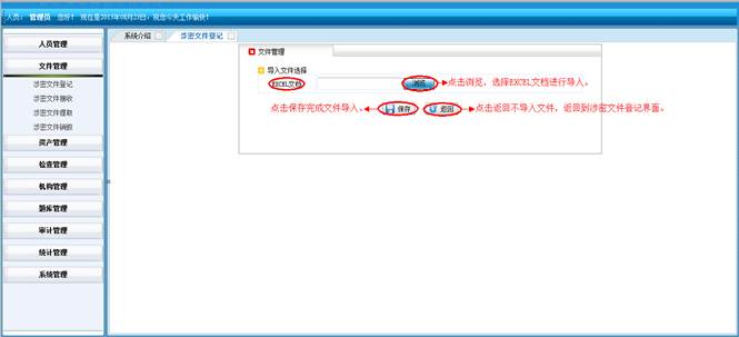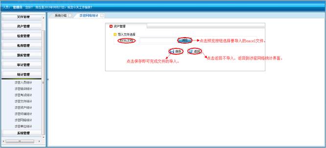 到题库管理界面,点击“浏览”按钮,选择要导入的Excel文件,点击“保存”按钮即可。点击返回按钮不导入文件,返回到涉密题库管理界面。