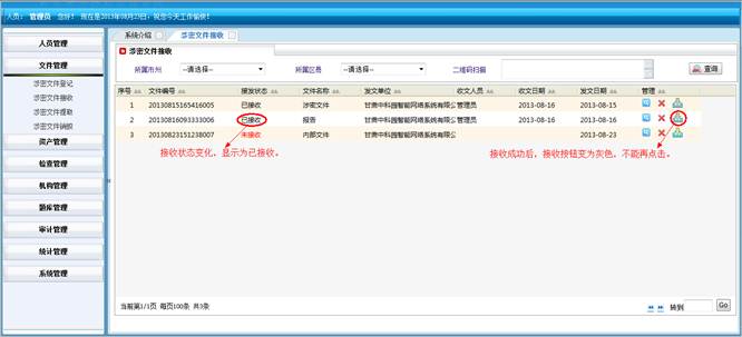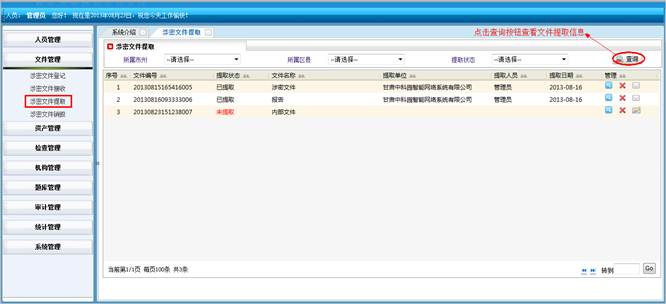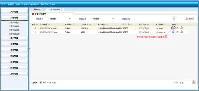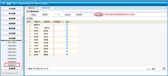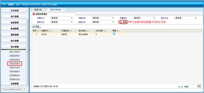 对所属地市和区县的涉密文件进行查询统计。将符合查询条件的信息导成EXCEL表格。