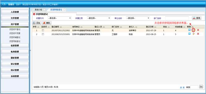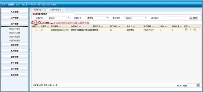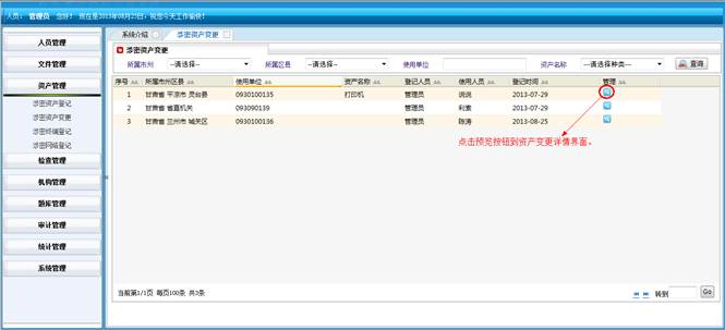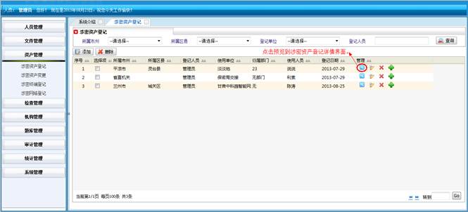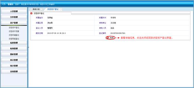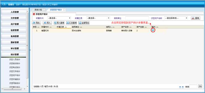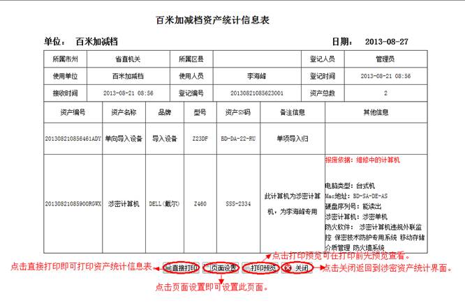 到资产统计详情界面,查看详细信息。然后点击“直接打印”打印资产统计的信息。点击“页面设置”设置页面。点击“打印预览”在打印前预览一下。点击“关闭”按钮返回到涉密资产统计界面。