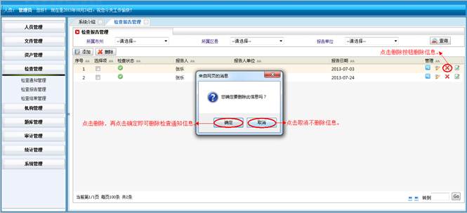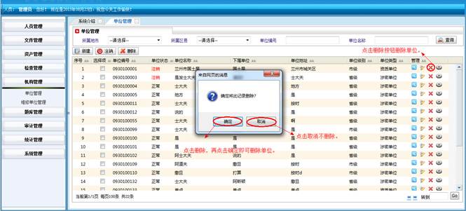在菜单管理界面,点击“删除”按钮,再点击“确定”按钮,即可删除菜单信息。点击“取消”按钮不删除信息。