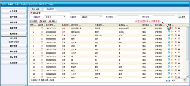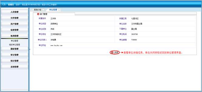 到单位统计详情界面,查看详细信息。然后点击“直接打印”打印单位统计的信息。点击“页面设置”设置页面。点击“打印预览”在打印前预览一下。点击“关闭”按钮返回到涉密单位统计界面。