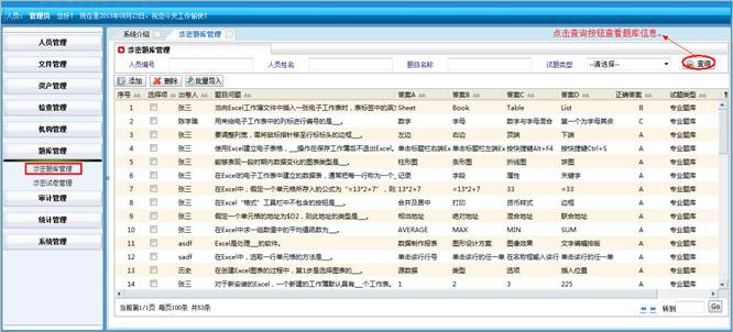 在涉密题库管理界面,填写信息(可选),点击“查询”按钮,未填写时查询所有的信息,填写时查询条件以内的信息。