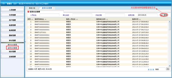 对登录系统人员的登录IP地址、登录单位名称、登录人员姓名和登录时间进行记录。可执行查询的操作