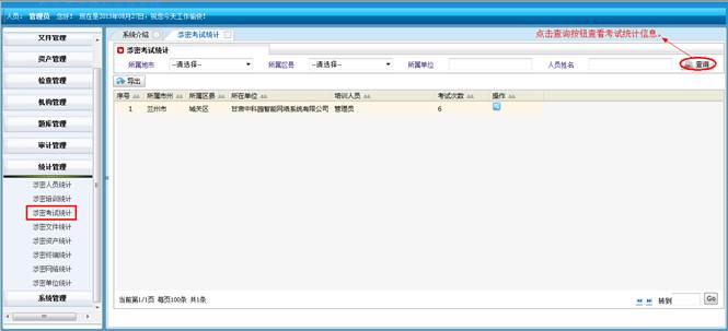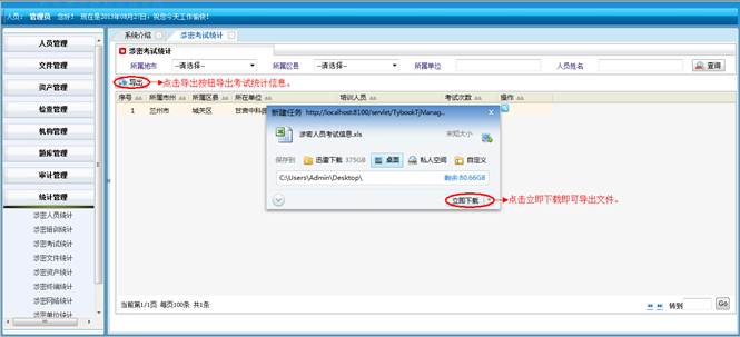 对所属地市和区县的涉密考试进行查询统计。将符合查询条件的信息导成EXCEL表格。