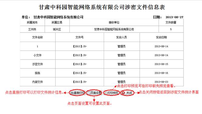 到文件统计详情界面,查看详细信息。然后点击“直接打印”打印文件统计的信息。点击“页面设置”设置页面。点击“打印预览”在打印前预览一下。点击“关闭”按钮返回到涉密文件统计界面。