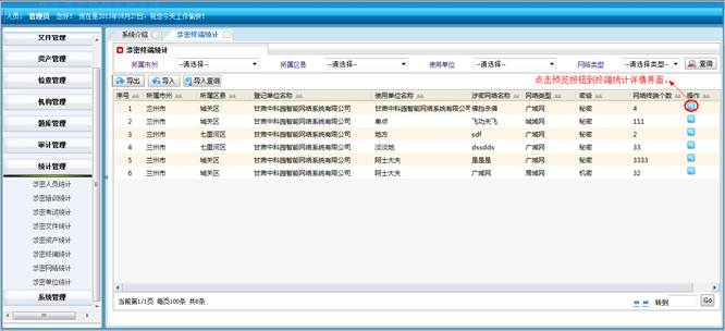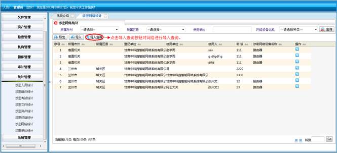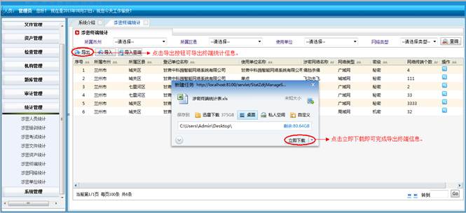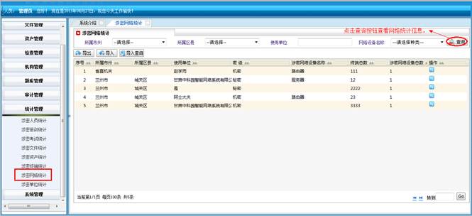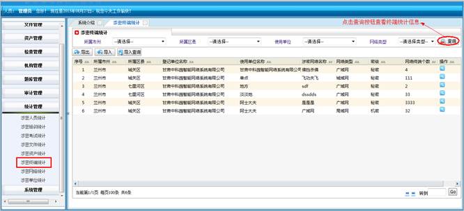 对所属地市和区县的涉密网络进行查询统计。将符合查询条件的信息导成EXCEL表格。