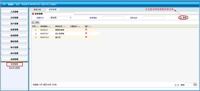 在菜单管理界面,填写信息(可选),点击“查询”按钮,未填写时查询所有的信息,填写时查询条件以内的信息。