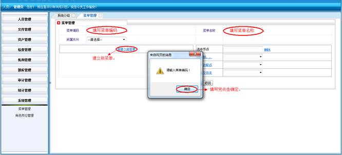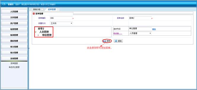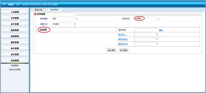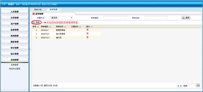 在菜单管理界面,点击“添加”按钮到菜单管理界面,管理员分配菜单(添加,查询)。