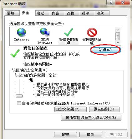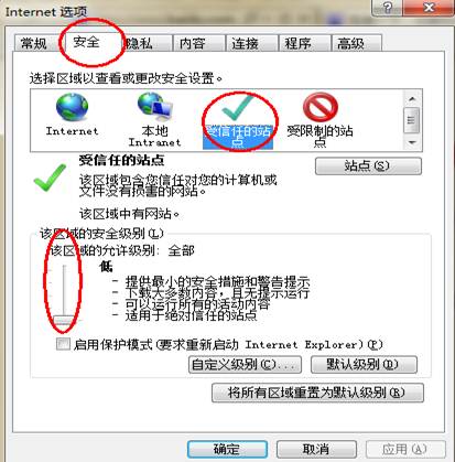 2.点击安全,选择信任事务站点,将该区域的安全级别拉到最低。